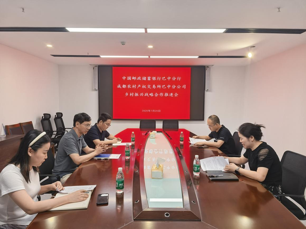 為充分發(fā)揮成都農(nóng)交所四川省農(nóng)村產(chǎn)權(quán)綜合交易平臺(tái)優(yōu)勢(shì)和郵儲(chǔ)銀行融資及其他綜合金融服務(wù)優(yōu)勢(shì),通過資源互補(bǔ)、信息互通、協(xié)作配合,共同推進(jìn)服務(wù)農(nóng)村集體經(jīng)濟(jì)組織和新型農(nóng)業(yè)經(jīng)營(yíng)主體的金融支農(nóng)工作。2025年7月25日下午,中國郵政儲(chǔ)蓄銀行巴中分行與成都農(nóng)村產(chǎn)權(quán)交易所巴中分公司、巴中市鑫匯農(nóng)業(yè)服務(wù)有限公司召開了鄉(xiāng)村振興戰(zhàn)略合作推進(jìn)會(huì)。